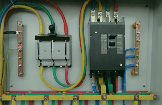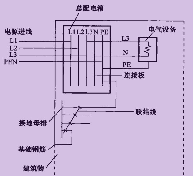TN-C-S系統(tǒng)中,配電干線在進入建筑物后是要直接接至總配電箱的,總配電箱內(nèi)的母線有L1、L2、L3、N和PE排,其中N和PE排往往設置在配電箱底部,便于進出線接線。