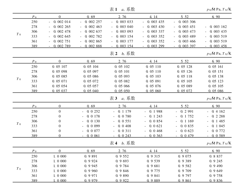 天然氣是復(fù)雜組分的混合氣體,主要成分為碳?xì)浠衔?即使在常壓下其性質(zhì)與理想氣體的差別也較大這主要是其比熱隨溫度的變化大,在高壓下壓縮系數(shù)的變化也較大下面介紹Johnson[6]提出的公式:<z=acf+bc(6)(6)中,z為介質(zhì)的壓縮系數(shù):z=azf+bz(7)f為組分因素:f=xC2H6+xCO2+2xC3H8+3xC4H10-12xN2(8)式(6)中,bc為入口處滯止壓力和滯止溫度的函數(shù),它代表甲烷(CH4)成分的作用系數(shù);ac為入口處滯止壓力和滯止溫度的函數(shù),acf代表除甲烷外其它成分的作用系數(shù);az、bz為入口滯止壓力和滯止溫度的函數(shù)ac、bc、az和bz分別見表1到表4