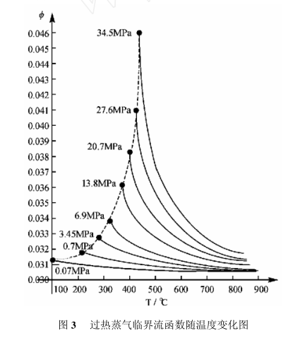 過熱蒸汽是比較接近液態(tài)的實際氣體,特別是壓力很高,過熱度又較小的過熱蒸汽更是如此如果再用(2)式來計算過熱蒸汽的臨界流函數(shù),將會產(chǎn)生驚人的誤差圖3為Murdock[7]給出的臨界流函數(shù)隨臨界流噴嘴入口蒸汽溫度和壓力變化的曲線圖從圖中可以看出,在p=34Mpa時,臨界流函數(shù)中的變化竟達(dá)45?之多,所以對于過熱蒸汽,根據(jù)平常給定的K=1.33,R=461.4按(2)式計算臨界流函數(shù)是不能容許的必須按實際值計算