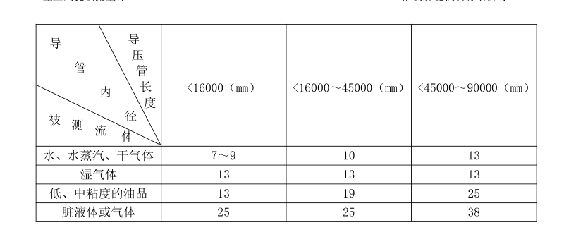 18、導(dǎo)壓管:導(dǎo)壓管的材質(zhì)應(yīng)按被測(cè)介質(zhì)的性質(zhì)和參數(shù)而定,其內(nèi)徑過小和長(zhǎng)度太長(zhǎng)會(huì)使信號(hào)嚴(yán)重滯后或失真,建議參照表(一)確定。