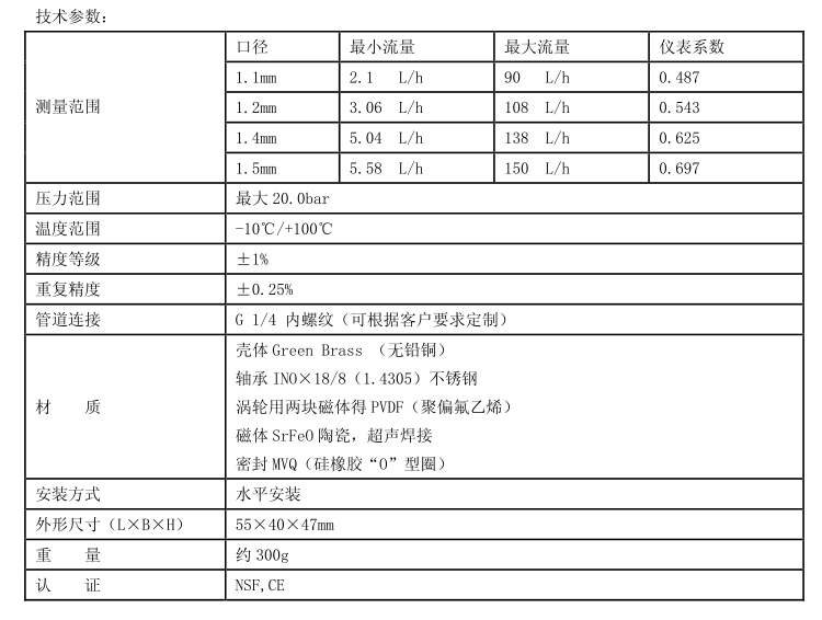 系列流量計(jì)用途十分廣泛: 可用于測(cè)量、 調(diào)節(jié)、 分配液體, 包括工業(yè)、 化學(xué)、 石油和商用咖啡機(jī)等。 當(dāng)應(yīng)用于食品衛(wèi)生工業(yè)時(shí), 其產(chǎn)品都通過美國(guó)國(guó)家食品安全部門(NSF) 的驗(yàn)證。