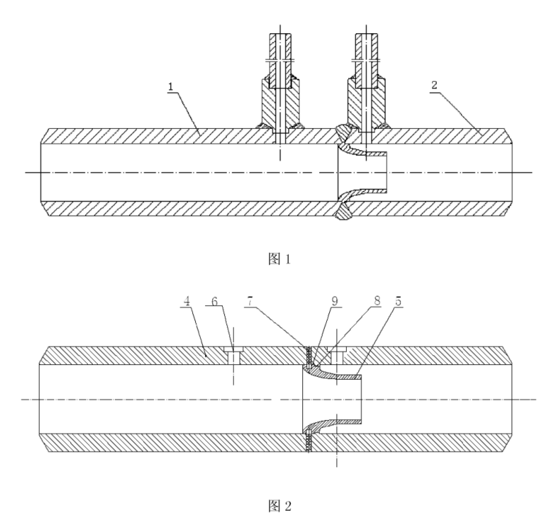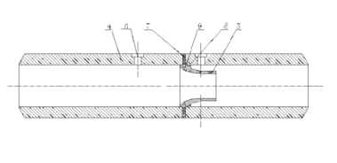 差壓式長徑噴嘴節(jié)流裝置采用將長徑噴嘴固定在工藝管道內(nèi)的工作型式。但傳統(tǒng)的差壓式長徑噴嘴在進(jìn)行長徑噴嘴與工藝管道焊接時,需要把工藝管道分成上游和游兩段。如圖I所示,焊接時,先把工藝管道的上游1和下游2倒坡口,再與長徑噴嘴5接,這種裝配結(jié)構(gòu)需要焊接,焊接時的裝配很難定位,需用專用的夾具,既費工時,而且工成本也高,其工藝也很難保證長徑噴嘴與工藝管道的同軸度。