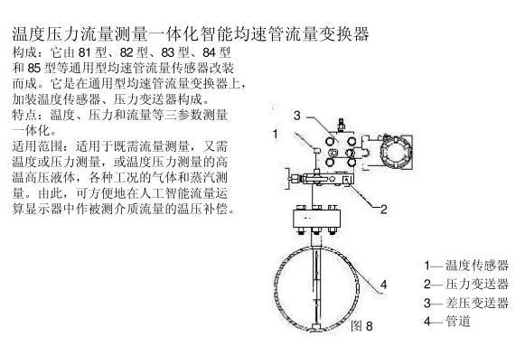 溫度壓力流量測量一體化智能均速管流量變換器構(gòu)成:它由 81型、82型、83型、84型和 85型等通用型均速管流量傳感器改裝而成。它是在通用型均速管流量變換器上加裝溫度傳感器、壓力變送器構(gòu)成。