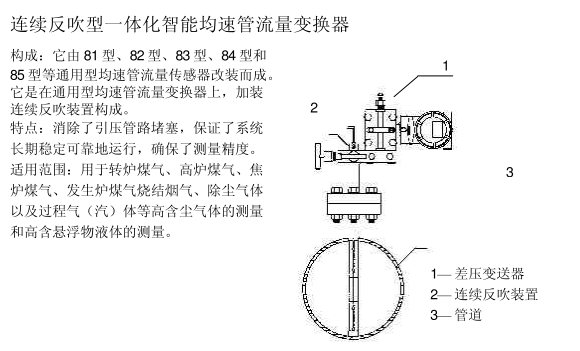 它是在通用型均速管流量變換器上,加裝連續(xù)反吹裝置構(gòu)成。