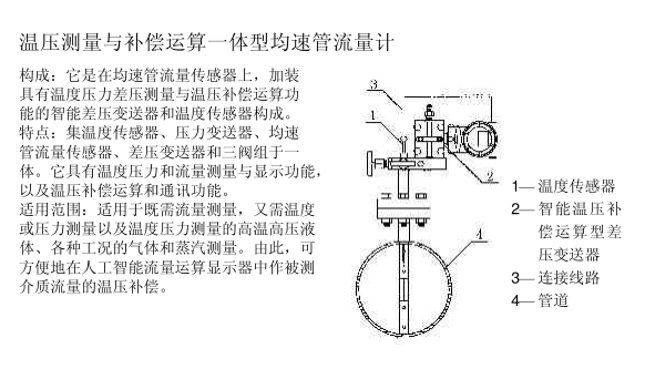 溫壓測量與補(bǔ)償運(yùn)算一體型均速管流量計(jì)構(gòu)成:它是在均速管流量傳感器上,加裝具有溫度壓力差壓測量與溫壓補(bǔ)償運(yùn)算功能的智能差壓變送器和溫度傳感器構(gòu)成。