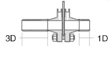 多孔平衡流量計(jì)對(duì)稱多孔設(shè)計(jì),能將流場(chǎng)快速整流成近似理想體,無需過多的直管段整流。同其它類型的差壓流量計(jì)相比,對(duì)前、后直管段的要求小,安裝時(shí)前直管段要求為3D,后直管段要求為1D(如圖)。