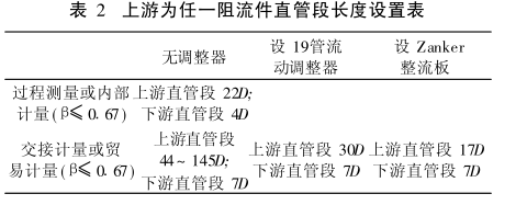 在無(wú)流動(dòng)調(diào)整器情況下,孔板流量計(jì)的直徑比、值小于等于067,且滿足孔板上游為任意阻流件時(shí),孔板上游直管段長(zhǎng)度按規(guī)定至少應(yīng)有44D,在阻流件為特殊復(fù)雜管路或匯管時(shí),上游直管段長(zhǎng)度可能需要60~145D。如此長(zhǎng)的直管段會(huì)增大站場(chǎng)面積,增加安裝難度,不利于工程費(fèi)用的降低和實(shí)施,見(jiàn)表2。