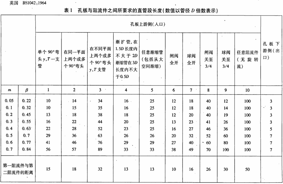 英國BSl042:1964孔板流量計(jì)直管段長度規(guī)定如表1所示孔板流量計(jì)直管段長度規(guī)定歷經(jīng)80余年終于由IS05167:2003(E)獲得統(tǒng)一,其特點(diǎn)可列舉若干如下。