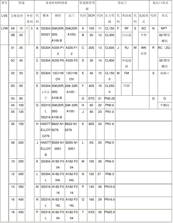 LVW06IIAE25FWN表示DN150管道式WN法蘭連接錐式流量計,外徑為159,錐體及錐體配件材質(zhì)為TP304、管道及法蘭的材質(zhì)均為20#,管道壁厚為SCH40,管法蘭為JB/T82.1/HG20595PN2.5WN、RF,帶頸對焊、凸臺面,取壓口1/2”錐管螺
