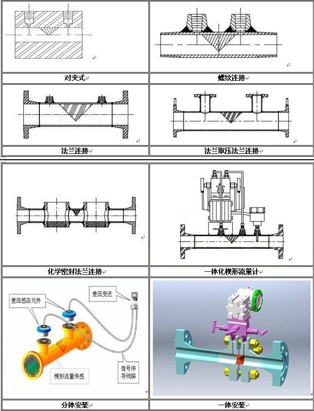 楔形流量計(jì)結(jié)構(gòu)形式:按其組裝方式分為一體型和分離型,按其連接方式分為法蘭連接、焊接連接、螺紋連接及對(duì)夾式連接,按其取壓方式分為普通取壓、法蘭密封取壓等結(jié)構(gòu)。詳見(jiàn)下表: