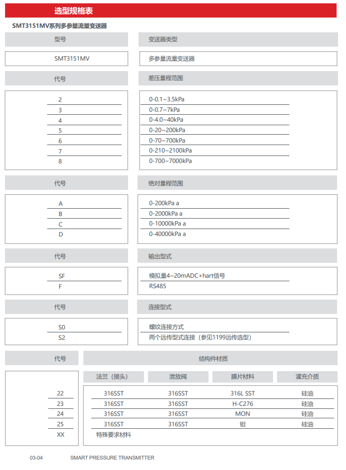 SMT3151MV系列多參量變送器差壓量程范圍為 50Pa~10MPa(0.5mbar~100bar),最大工作壓力分別為 0.6MPa、2MPa、10MPa 或 40MPa。針對高溫、高腐蝕、粘稠介質(zhì)可以提供各種規(guī)格的法蘭連接型式,以適應(yīng)不同復(fù)雜的工業(yè)現(xiàn)場需要。